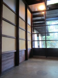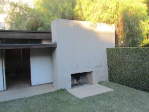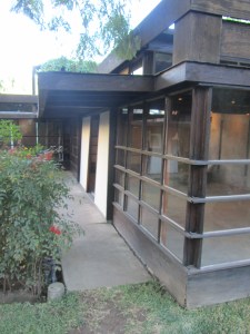 Immediately one discerns that this is no ordinary home, in fact it is rather exceptional in several ways. Firstly, the layout is of two adjoining ‘L’s conceived to accommodate two artist couples and thus an early experiment in communal living. Each of the four artists were allocated their own studio, and each couple shared an outdoor ‘sleeping basket’ on the roof. Kitchen and bathroom facilities were shared but the design also incorporated a guest studio with its own separate kitchen and bathroom. Secondly, Schindler was keen to experiment with the ‘tilt-up’ concrete wall method and therefore the house’s construction is also fairly unique. In the tilt-up method concrete is first poured for both foundation and final floor surface (cold underfoot in winter but no doubt a blessing during the hot summers in Los Angeles). Separate sections are then poured horizontally abutting the slab and once set lifted-up to near vertical to form walls (by all accounts this was a more difficult process than anticipated). Between each wall section a gap of 3” was left and variously filled with either more concrete, or glass panels to form narrow windows. These slit like windows lend the house a rather impenetrable fortress-like appearance from the street, but stepping inside, Schindler took inspiration from traditional Japanese homes and the walls facing the private rear garden are instead comprised of delicately glazed panels. Unusually for a building of this period the window frames are of wood construction not steel.